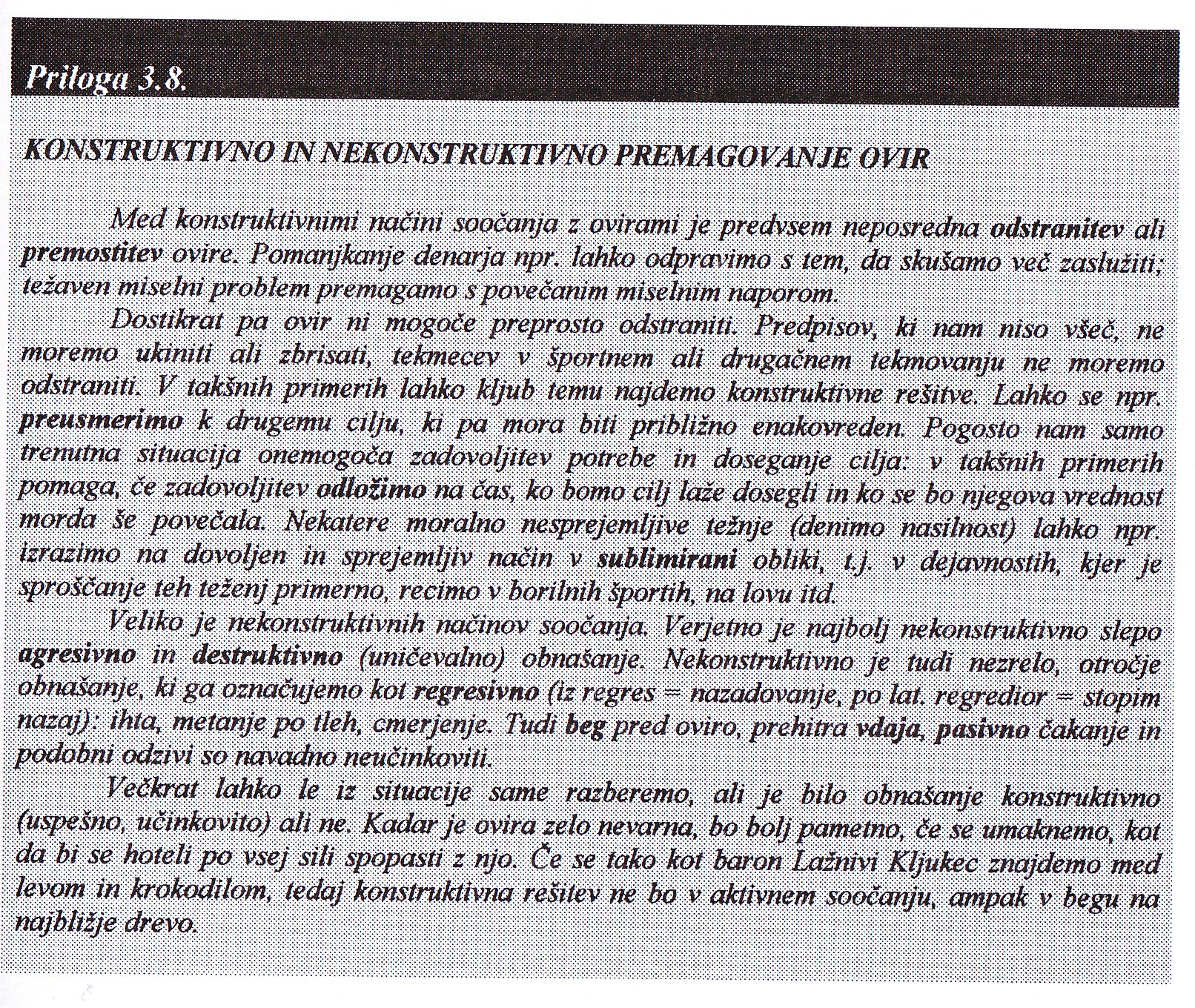 Konstruktivno in nekonstruktivno premagovanje ovir 22.01.2021 Gimnazijec z Lave Retromaterial Comments Off on Konstruktivno in nekonstruktivno premagovanje ovir Vir: Psihologija, J. Musek, V. Pečjak, Educy, 1997 Share this:FacebookX