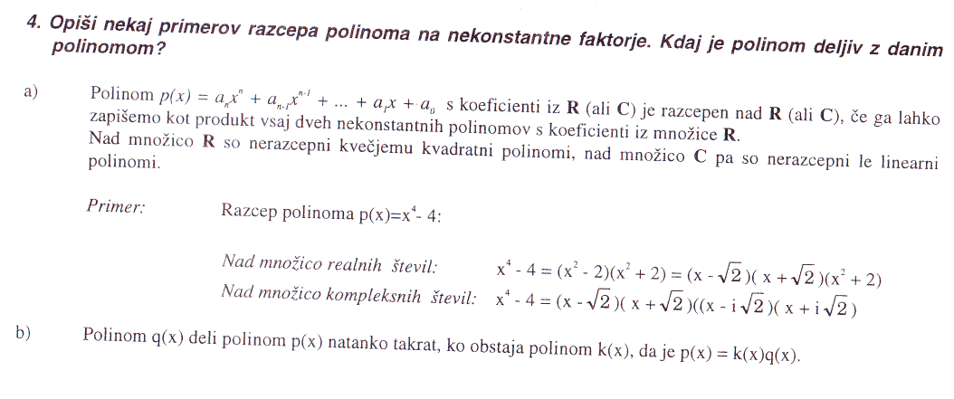 Opiši nekaj primerov razcepa polinomov na nekonstantne faktorje. Kdaj je polinom deljiv z danim polinomom? 26.02.2021 Gimnazijec z Lave Matura iz matematike Comments Off on Opiši nekaj primerov razcepa polinomov na nekonstantne faktorje. Kdaj je polinom deljiv z danim polinomom? Vir: Zbirka odgovorov na ustna vprašanja iz maturitetnega kataloga za matematiko Share this:FacebookX